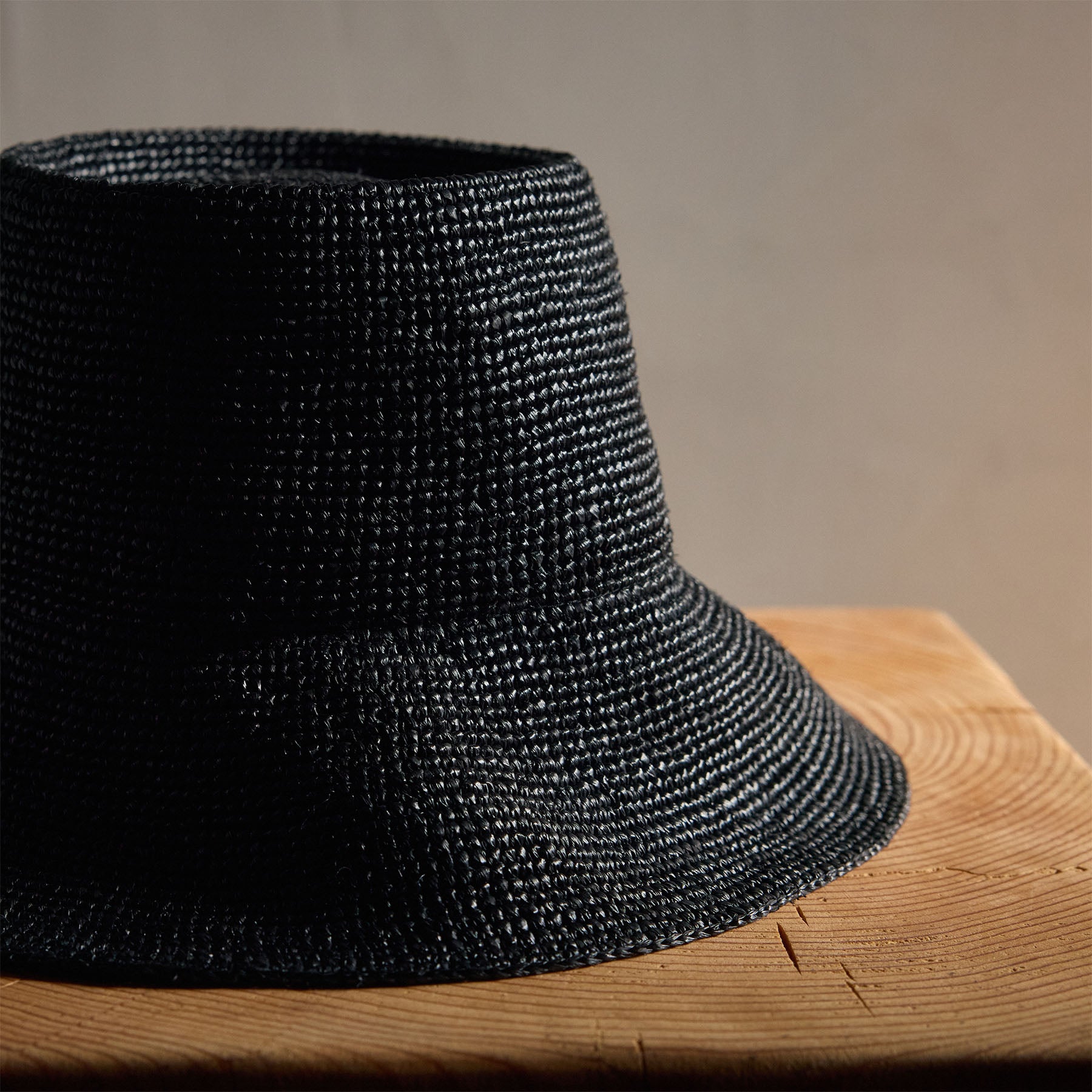 Janessa Leone Felix, a raffia straw bucket hat made for summer. This short-brimmed crochet bucket hat was intricately crocheted to create a flexible and structured design. This effortless bucket hat can easily be worn year-round and is meant for traveling with you wherever you go whether in a suitcase, a purse or a beach bag