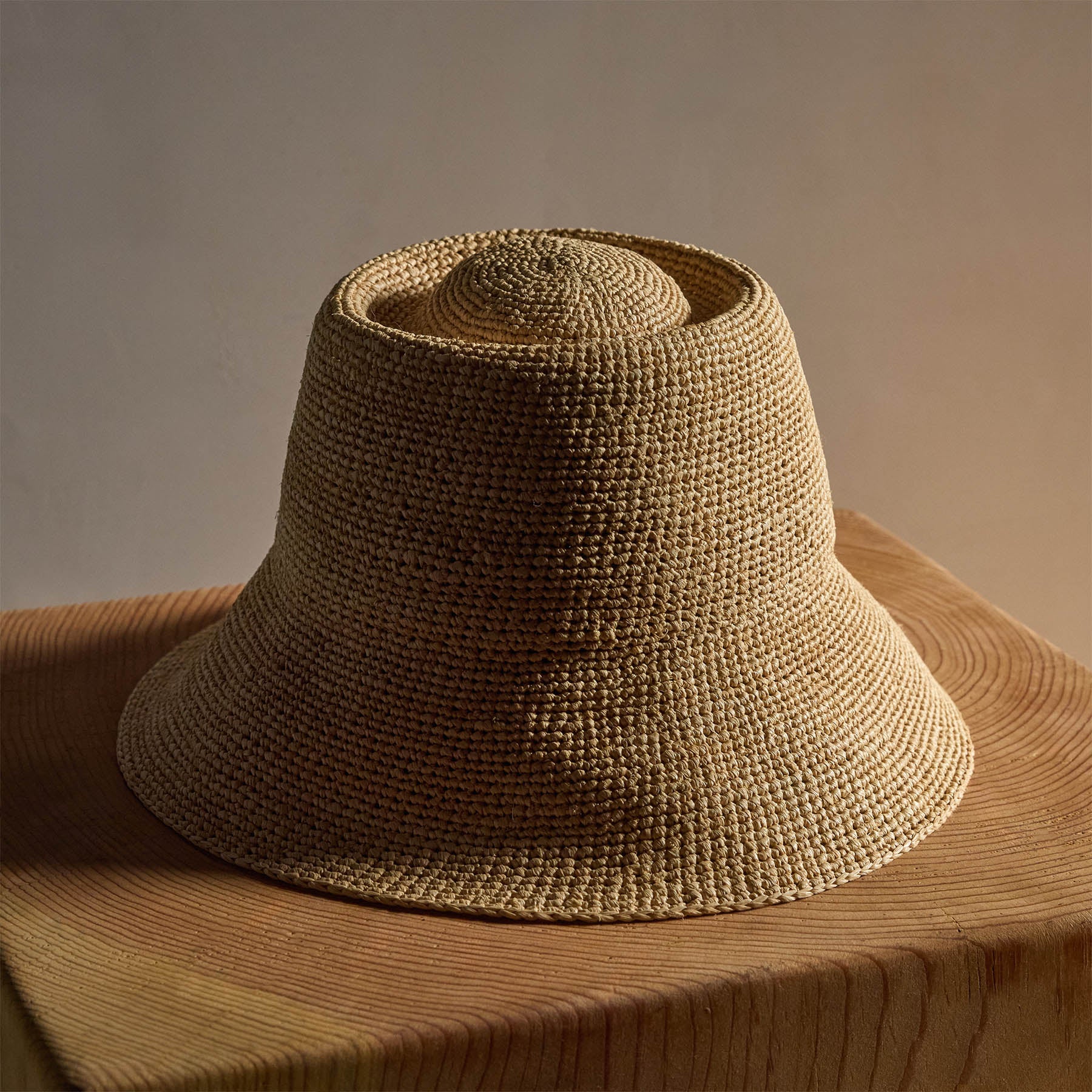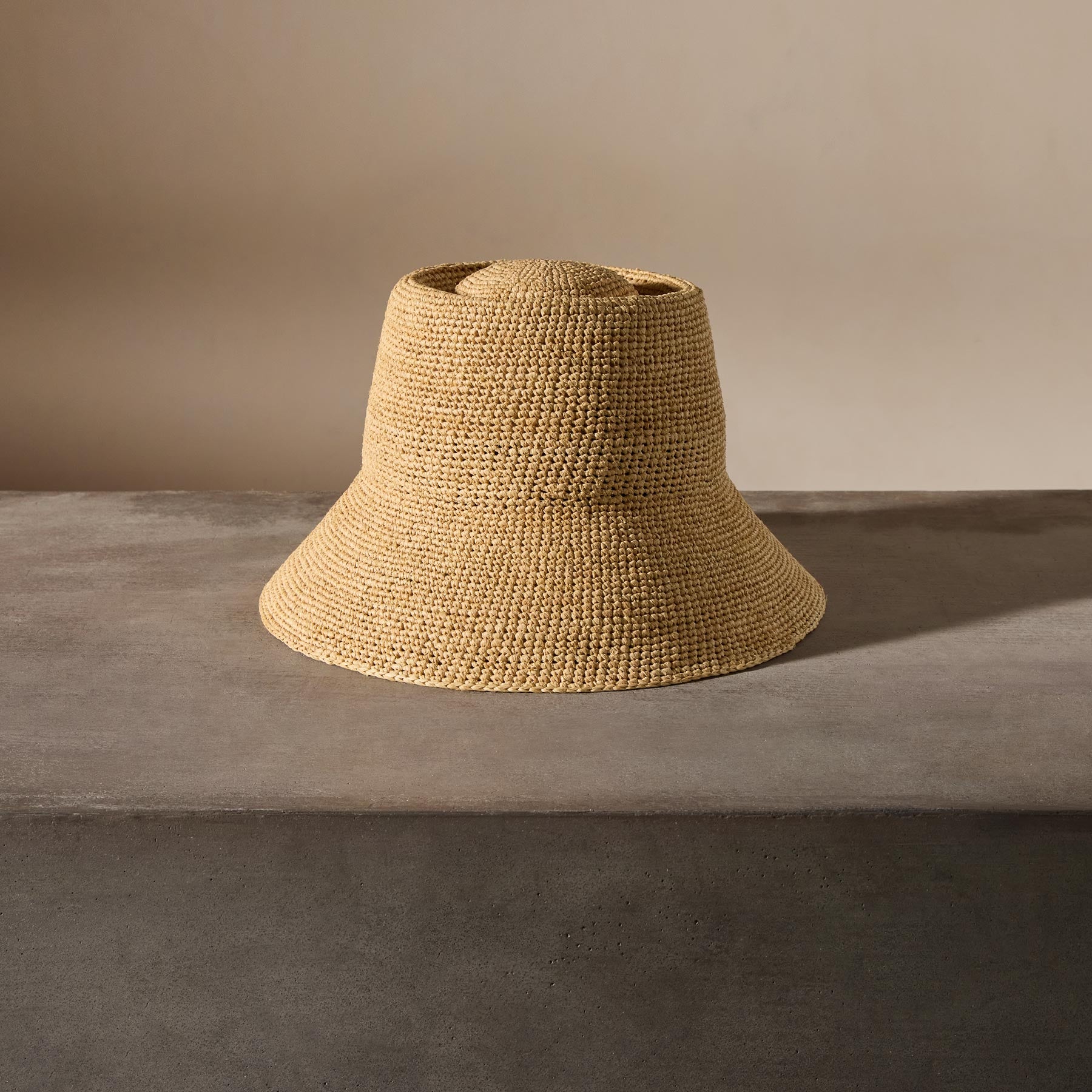 Janessa Leone Felix, a raffia straw bucket hat made for summer. This short-brimmed crochet bucket hat was intricately crocheted to create a flexible and structured design. This effortless bucket hat can easily be worn year-round and is meant for traveling with you wherever you go whether in a suitcase, a purse or a beach bag