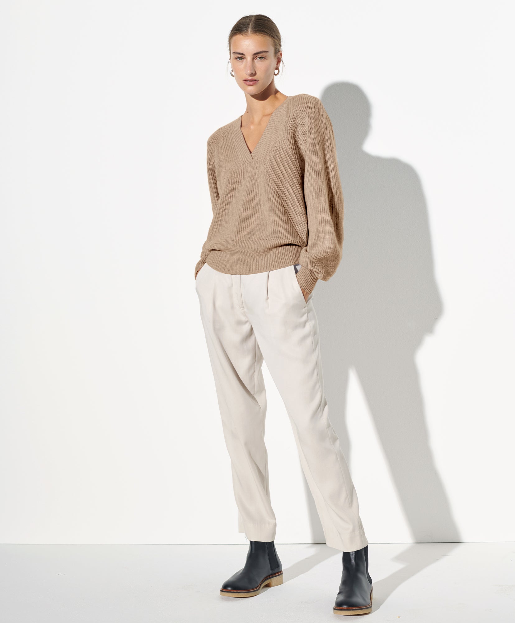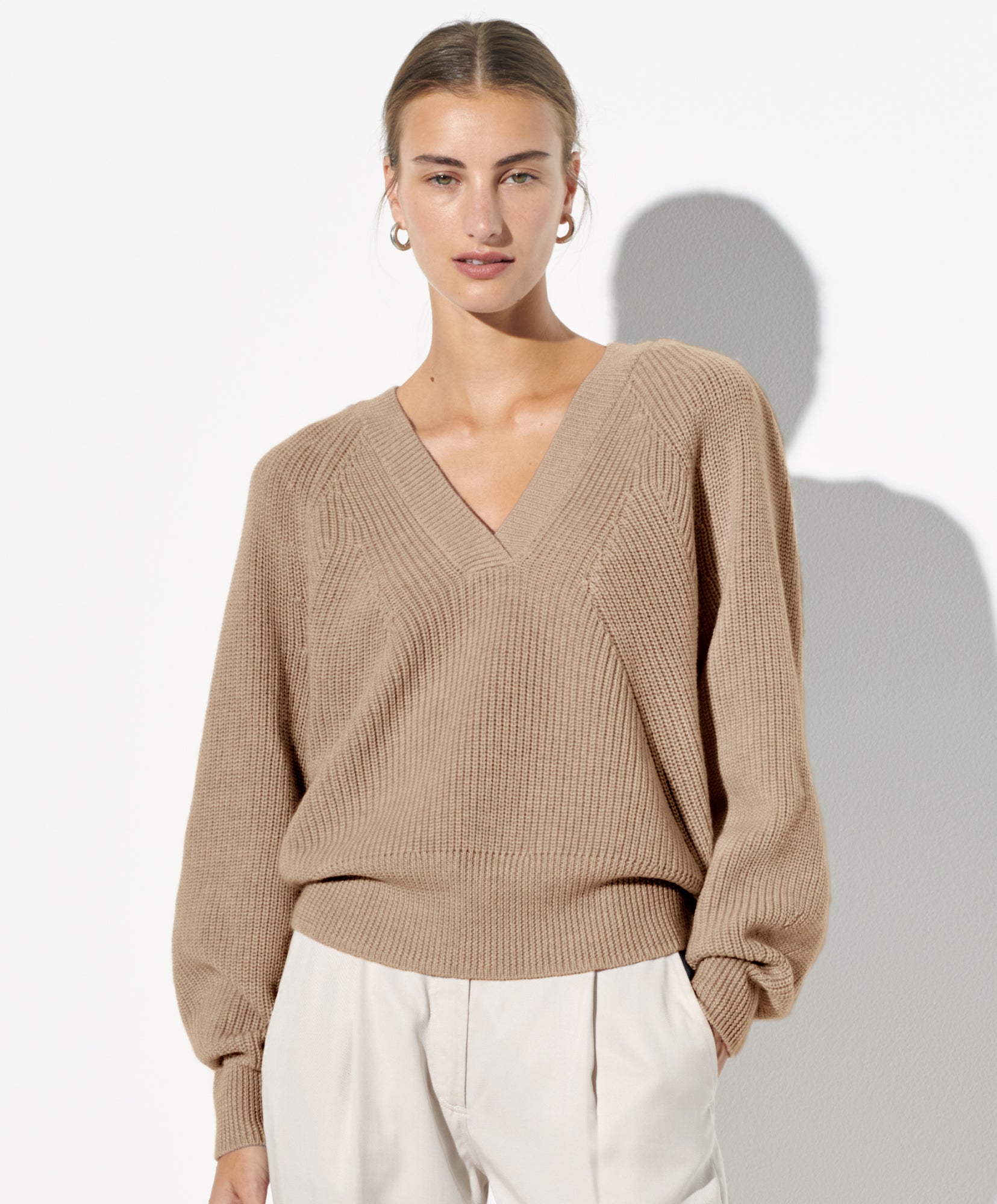 No matter how often you wear it, this one always looks fresh. We’ve taken everything you love about a classic ribbed sweater and updated all the details—a comfy-cool V-neck, balloon sleeves that puddle perfectly, and contrast ribbing galore.