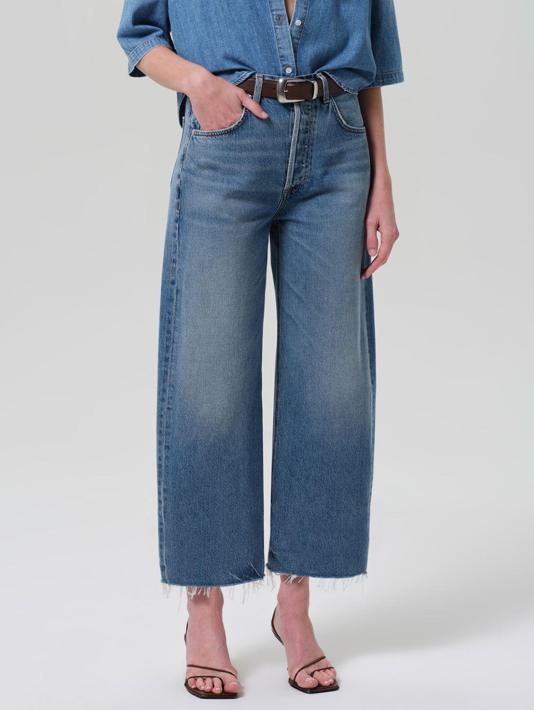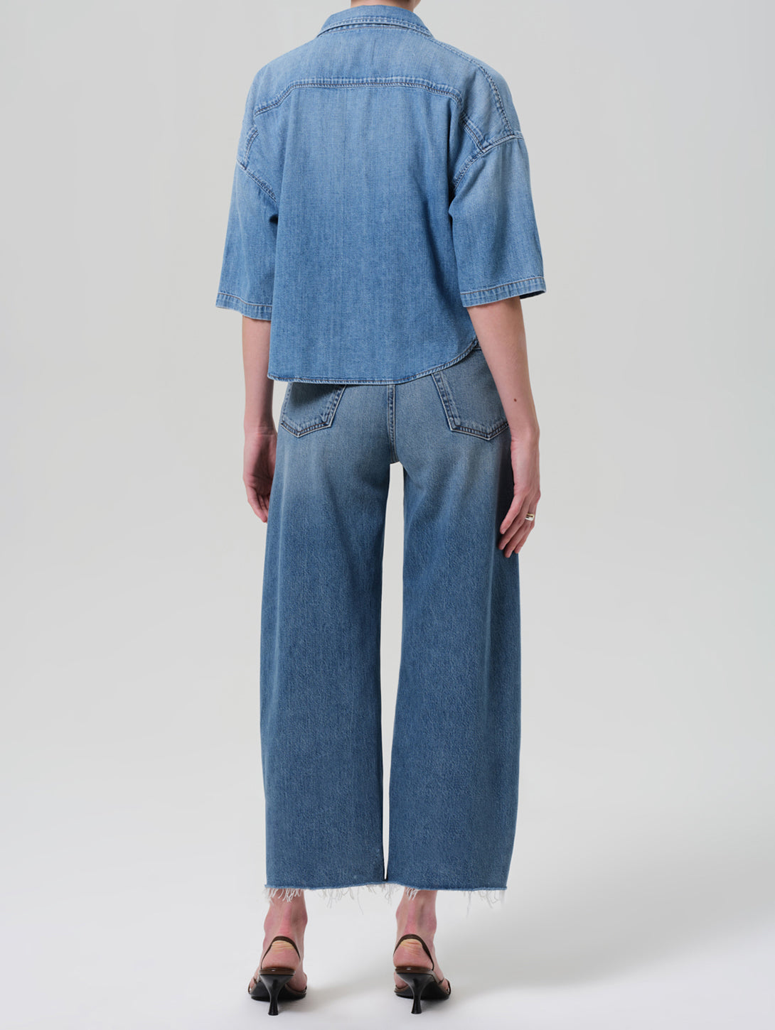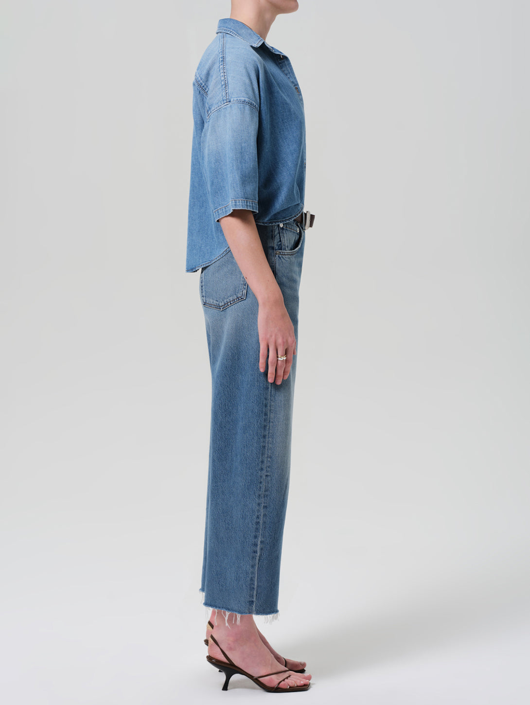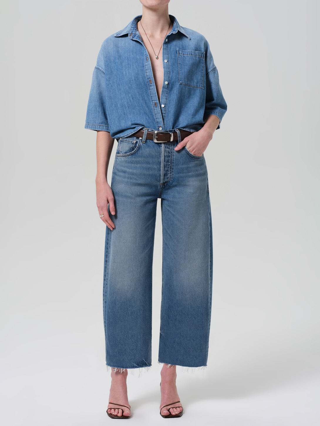 The Ayla Raw Hem Crop, inspired by a reworked vintage silhouette, features a slightly relaxed but flattering top block that transitions into a roomy leg with a raw hem finish. Perfect for warmer days, this cropped denim is crafted from 100% regenerative cotton, offering both comfort and sustainability in a timeless, versatile style. Style it effortlessly with a tucked-in blouse and sandals for a relaxed daytime look, or elevate it with a sleek heel and tailored blazer for an elevated take on casual chic.