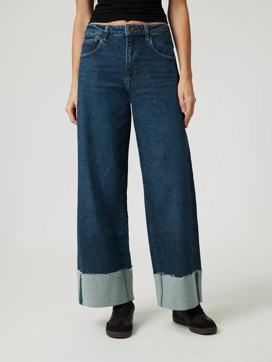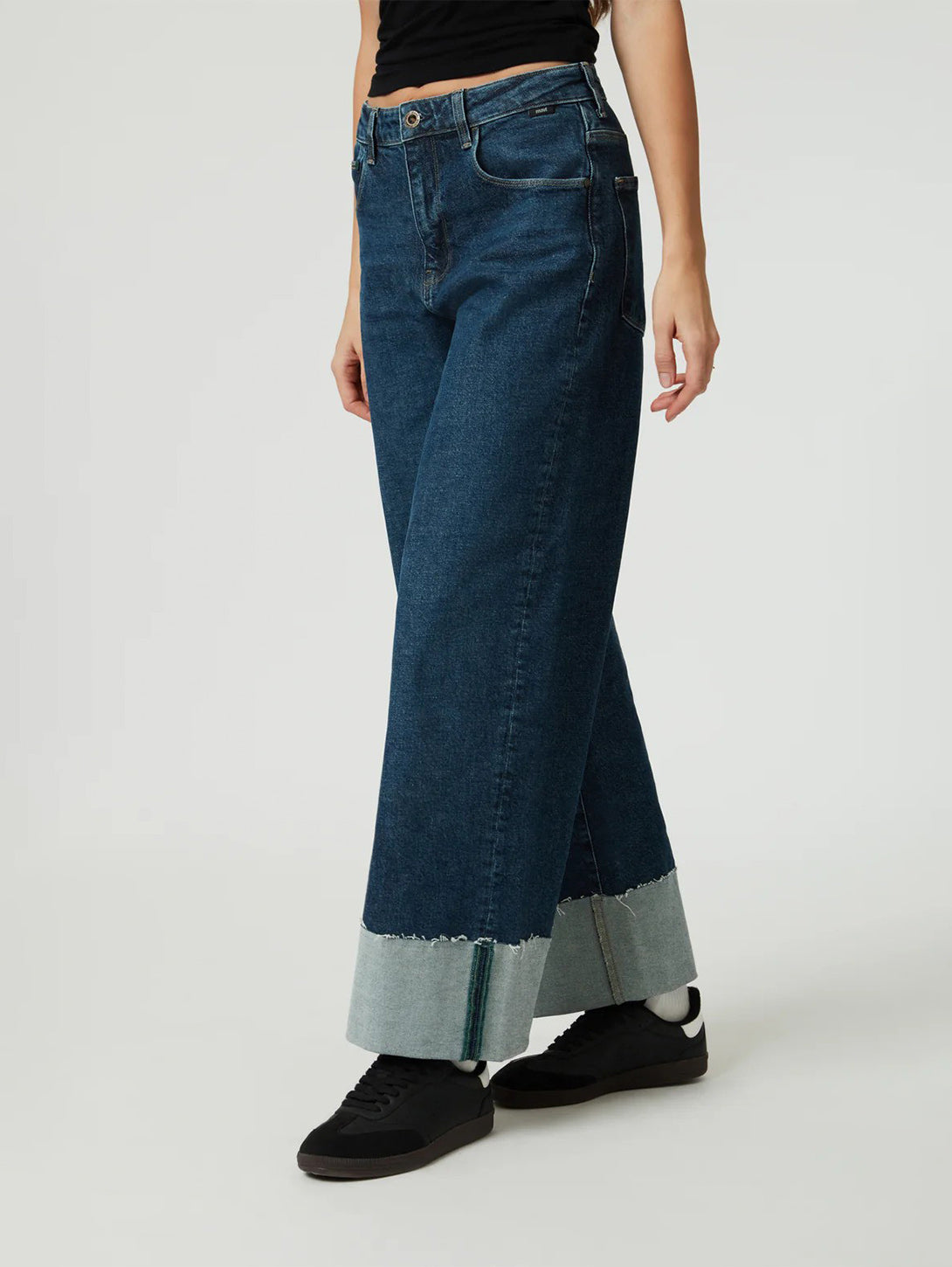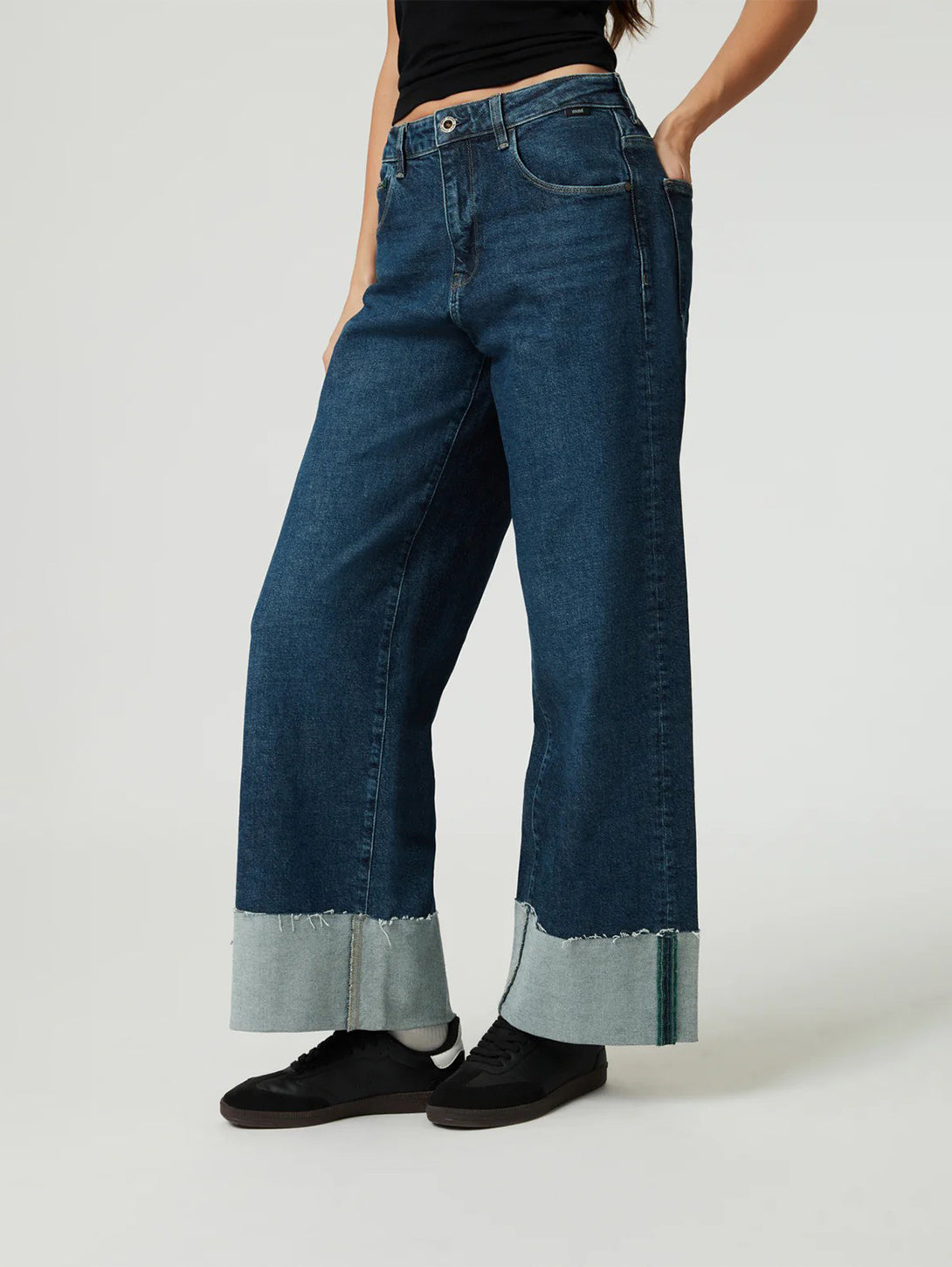 Cathy Cuff Jeans in Dark Blue Denim are a stylish and comfortable addition to your wardrobe. With a wide leg and mid rise, these jeans are designed for ease of movement and all-day comfort. Made from sustainable regenerative cotton, they have a structured vintage look with just the right amount of stretch. Upgrade your denim game with Cathy.