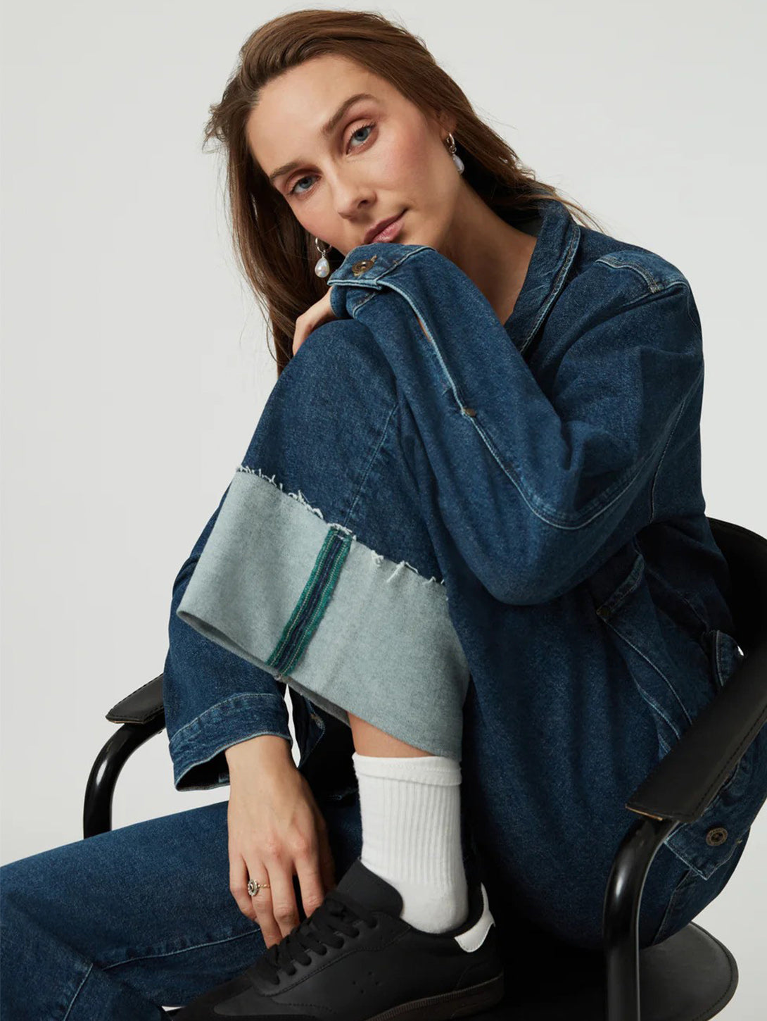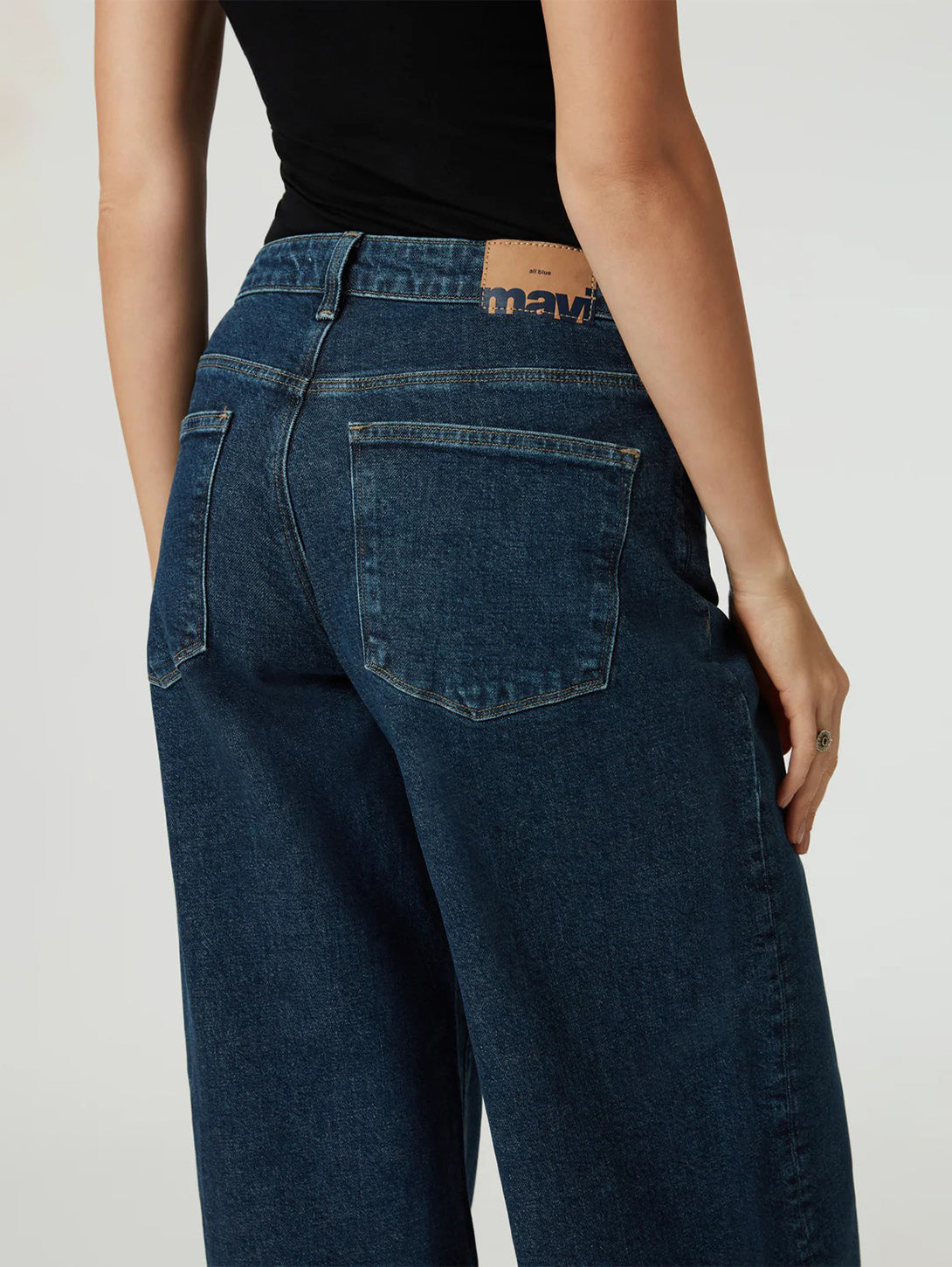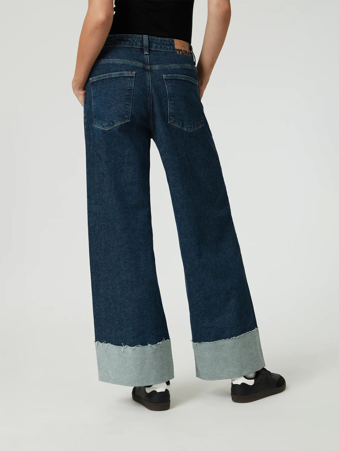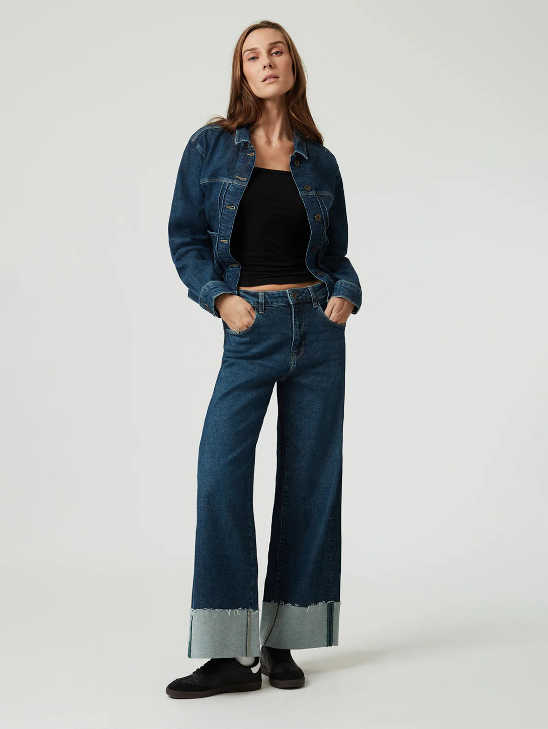 Cathy Cuff Jeans in Dark Blue Denim are a stylish and comfortable addition to your wardrobe. With a wide leg and mid rise, these jeans are designed for ease of movement and all-day comfort. Made from sustainable regenerative cotton, they have a structured vintage look with just the right amount of stretch. Upgrade your denim game with Cathy.