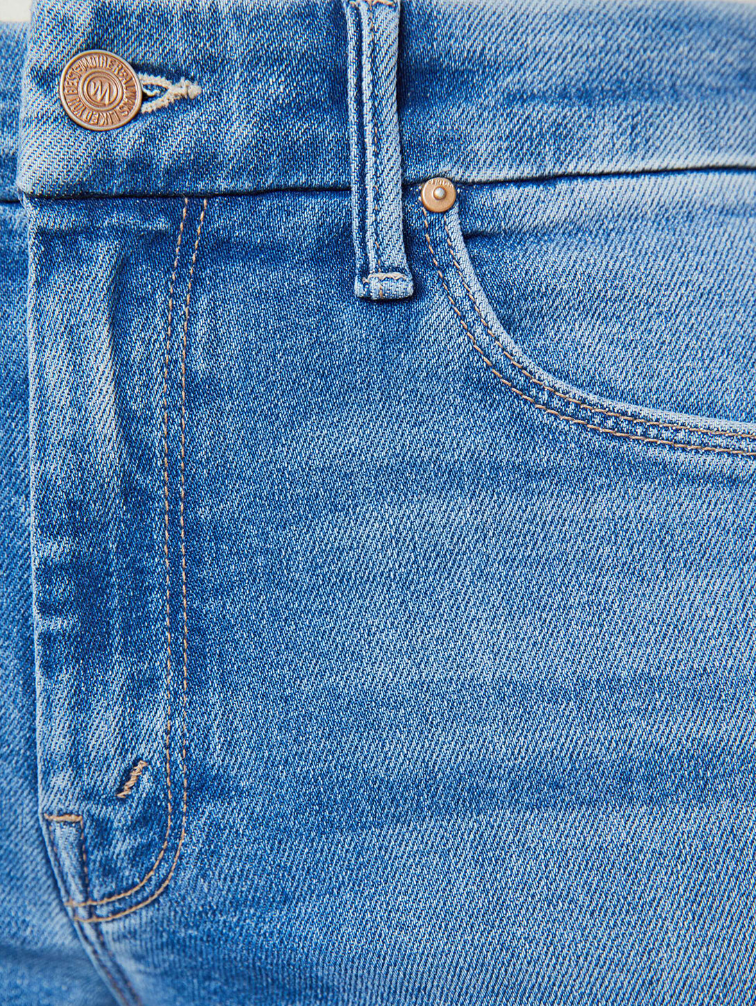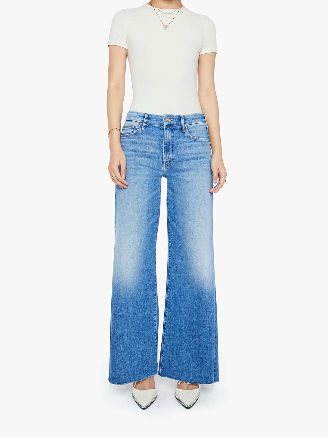 This iconic high-waisted wide leg has a 29-inch inseam and a frayed hem. Made from stretch denim, Fan Favourite is a mid-blue wash with subtle whiskering and fading at the knees."