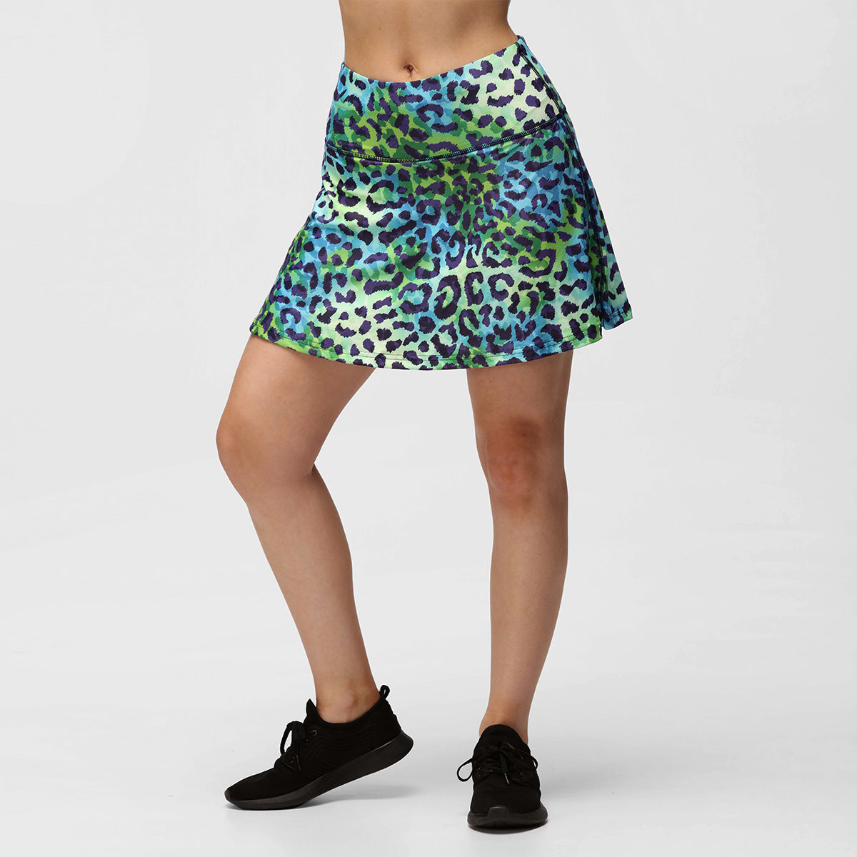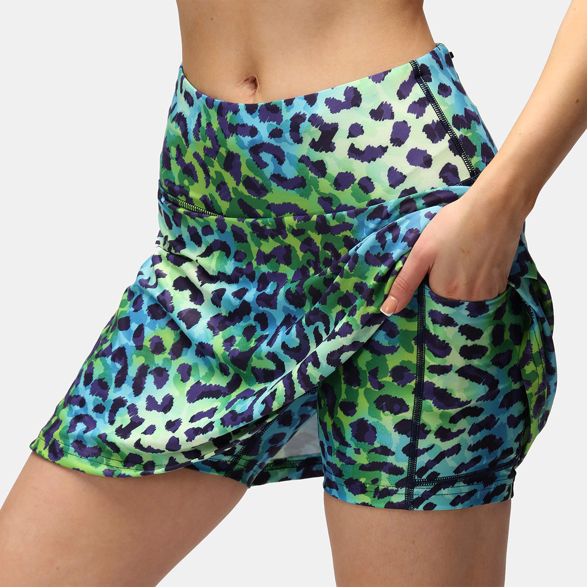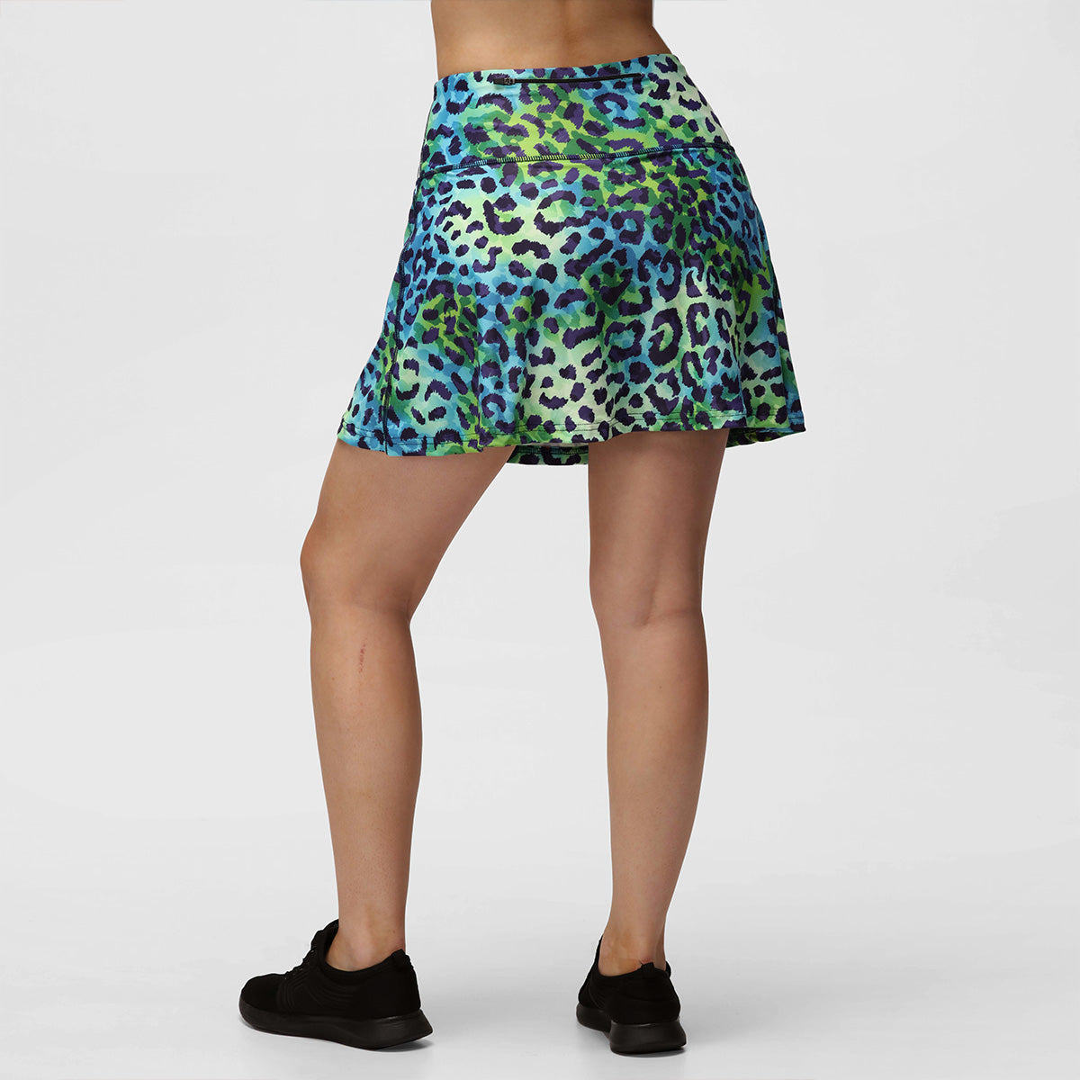 Retro Fusion: The Earth Cat Retro Skort showcases a captivating blue and green animal print that brings vintage aesthetics to the forefront of your sporty wardrobe.