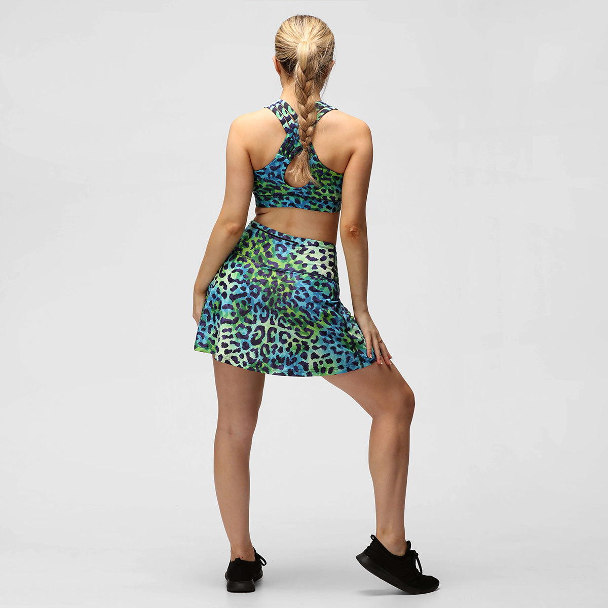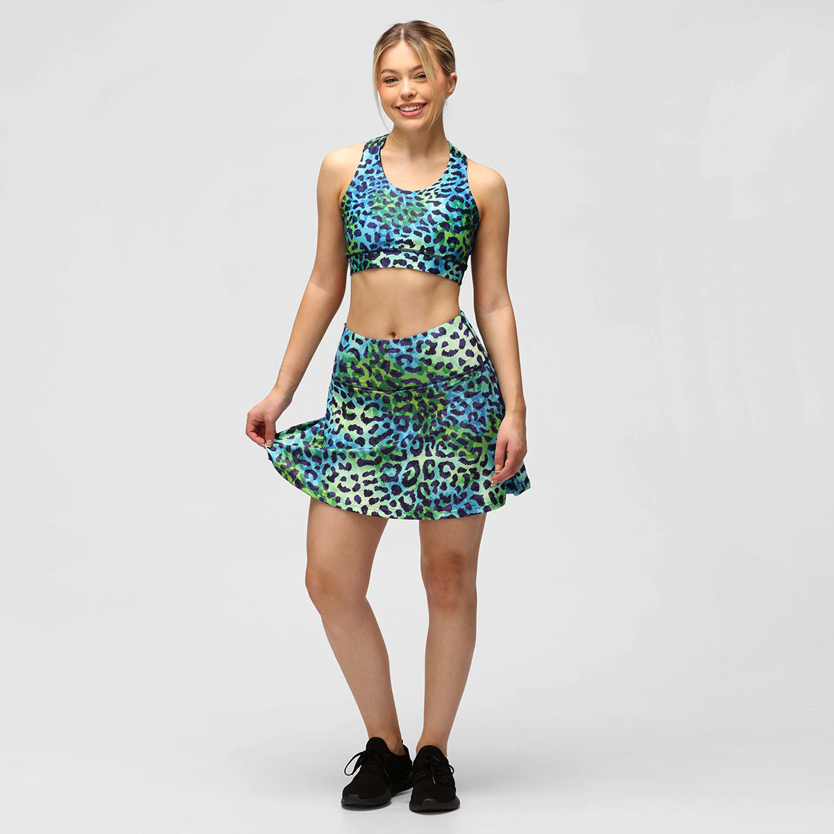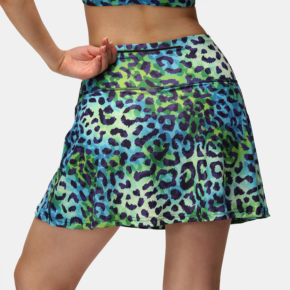 Retro Fusion: The Earth Cat Retro Skort showcases a captivating blue and green animal print that brings vintage aesthetics to the forefront of your sporty wardrobe.